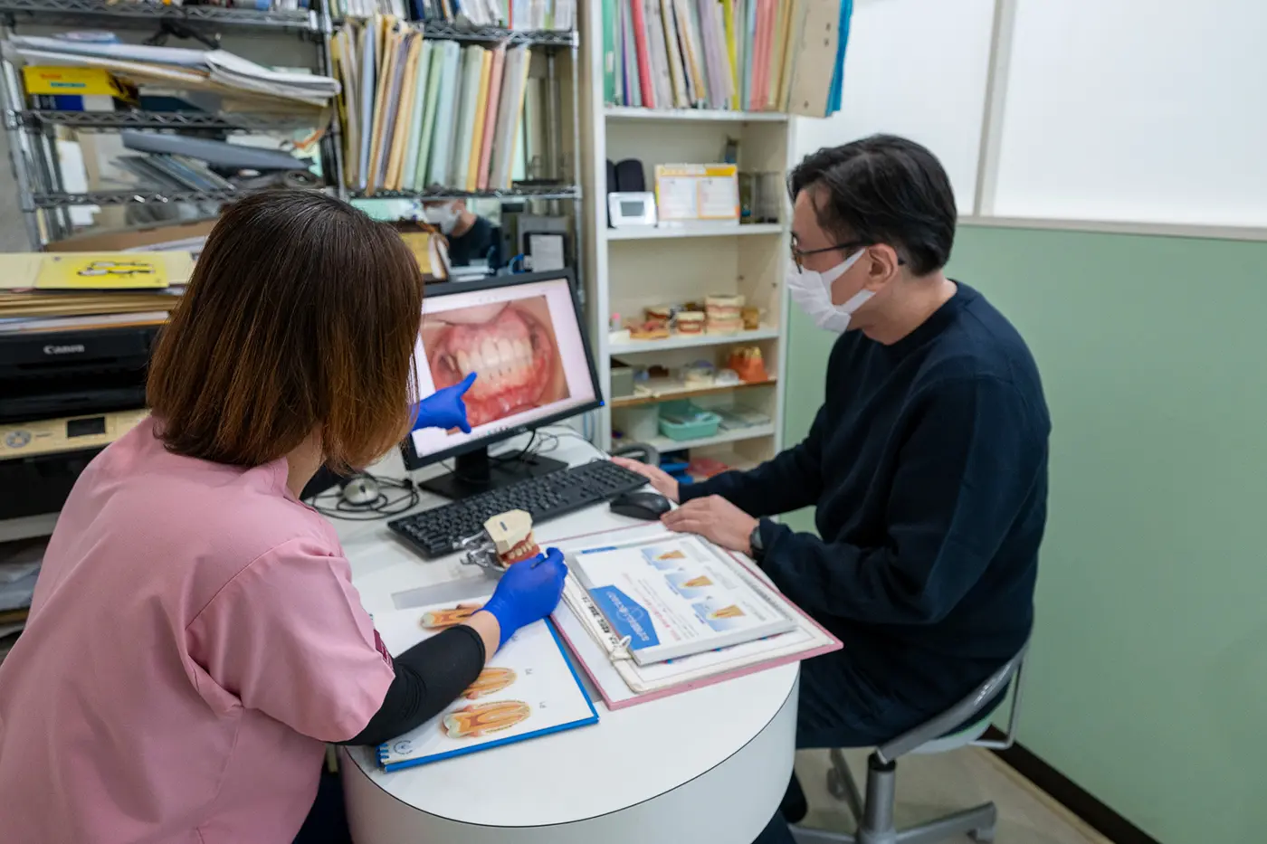 必要に応じて技工士が診療に立ち会います。直接お口の中を拝見することにより、歯の色合いや形態、噛み合わせの確認など患者さんのニーズに細かく対応することができます。